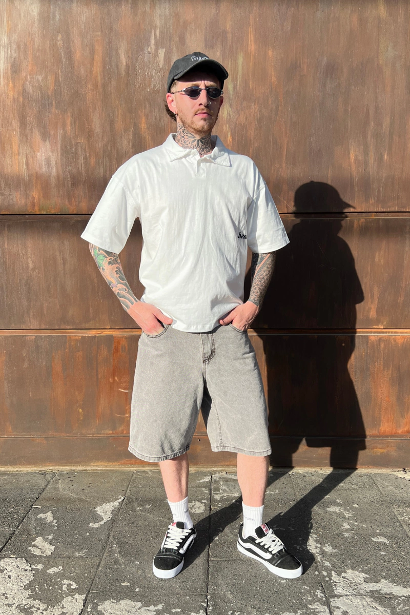 Confeccionado en Denim rigido, con un calce Skater de piernas anchas y superando el largo de rodillas, cinco bolsillos clasicos y un efecto de lavado que le da un estilo y tono unicos! . Cierre frontal con cremallera y botón.