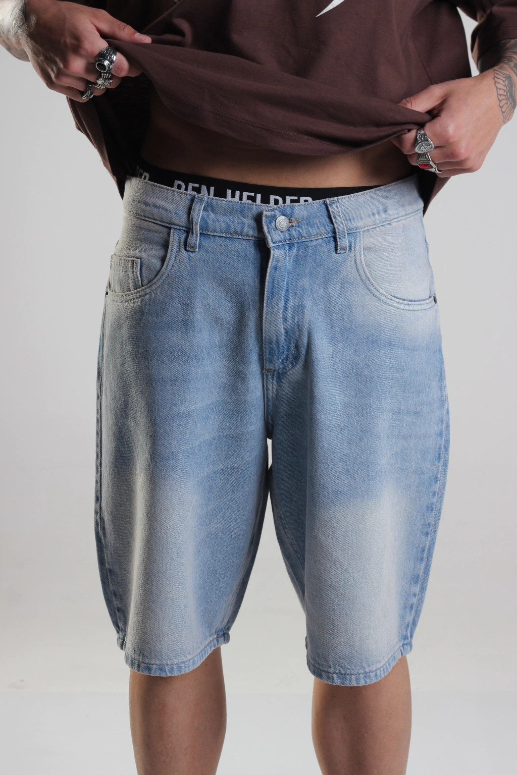 Confeccionado en Denim rigido, con un calce Skater de piernas anchas y superando el largo de rodillas, cinco bolsillos clasicos y un efecto de lavado de desgaste, incluyendo tratamiento con tecnología laser. Cierre frontal con cremallera y botón.