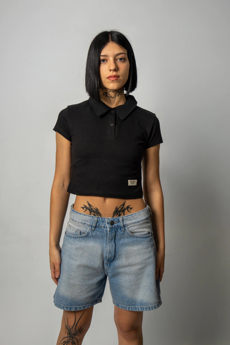 Confeccionada en Denim, con un calce Regular de piernas rectas por encima de las rodillas, cinco bolsillos clasicos y un teñido con efecto de desgaste. Cierre frontal con cremallera y botón.