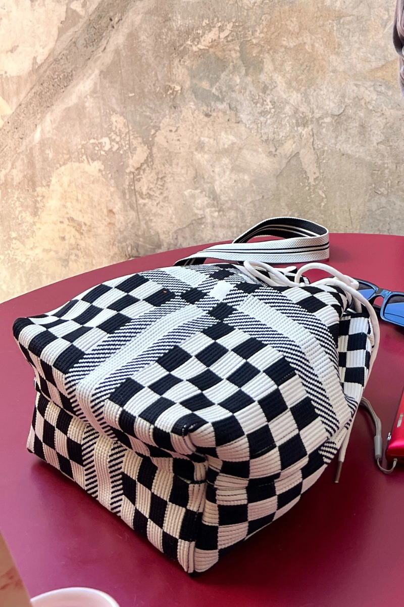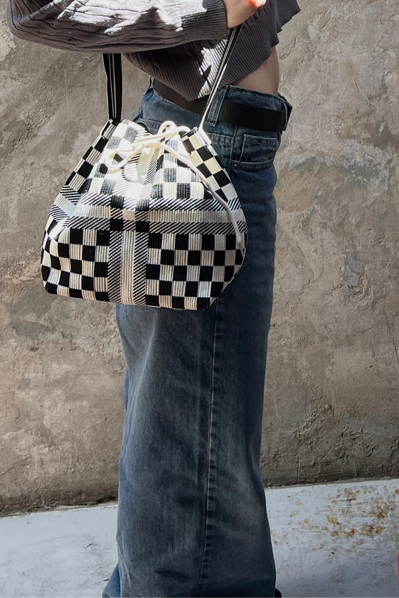 Minibag tejido, trama bicolor, con correa larga y cierre superior con cordon ajustable.