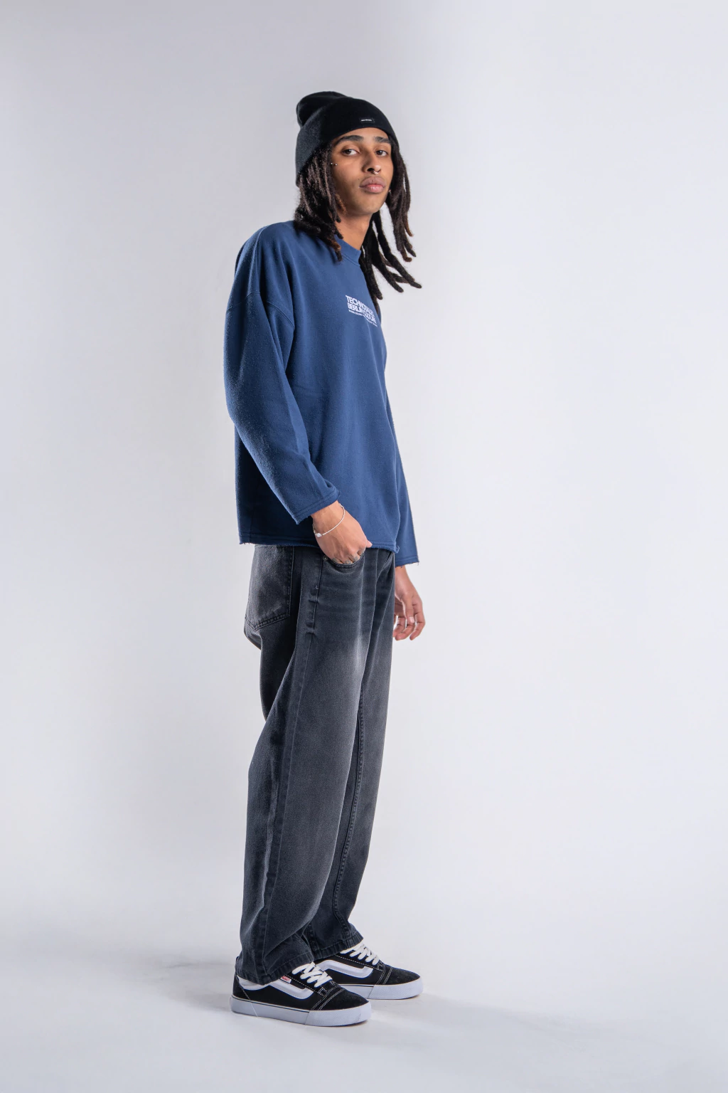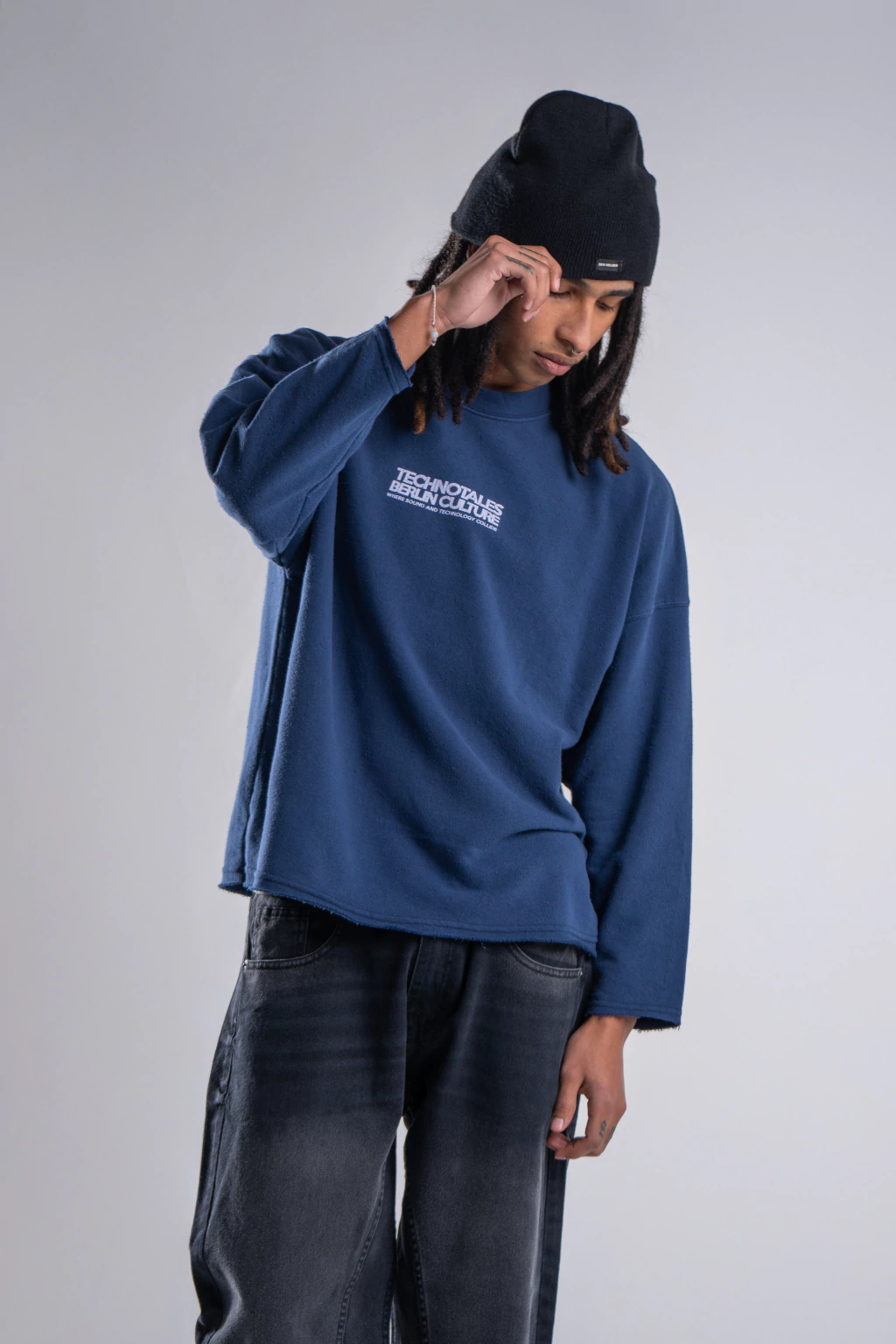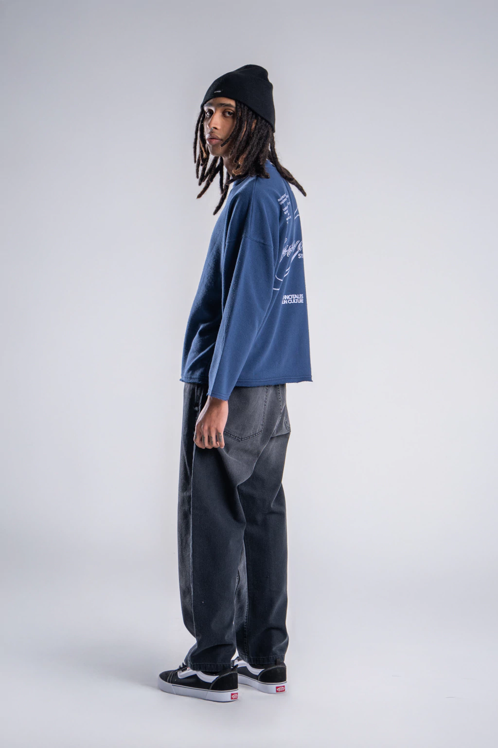 Confeccionado en Algodon Rustico, este buzo tiene un calce Boxy con terminaciones rusticas , esta estampado tanto en su parte delantera como tambien en su espalda.
