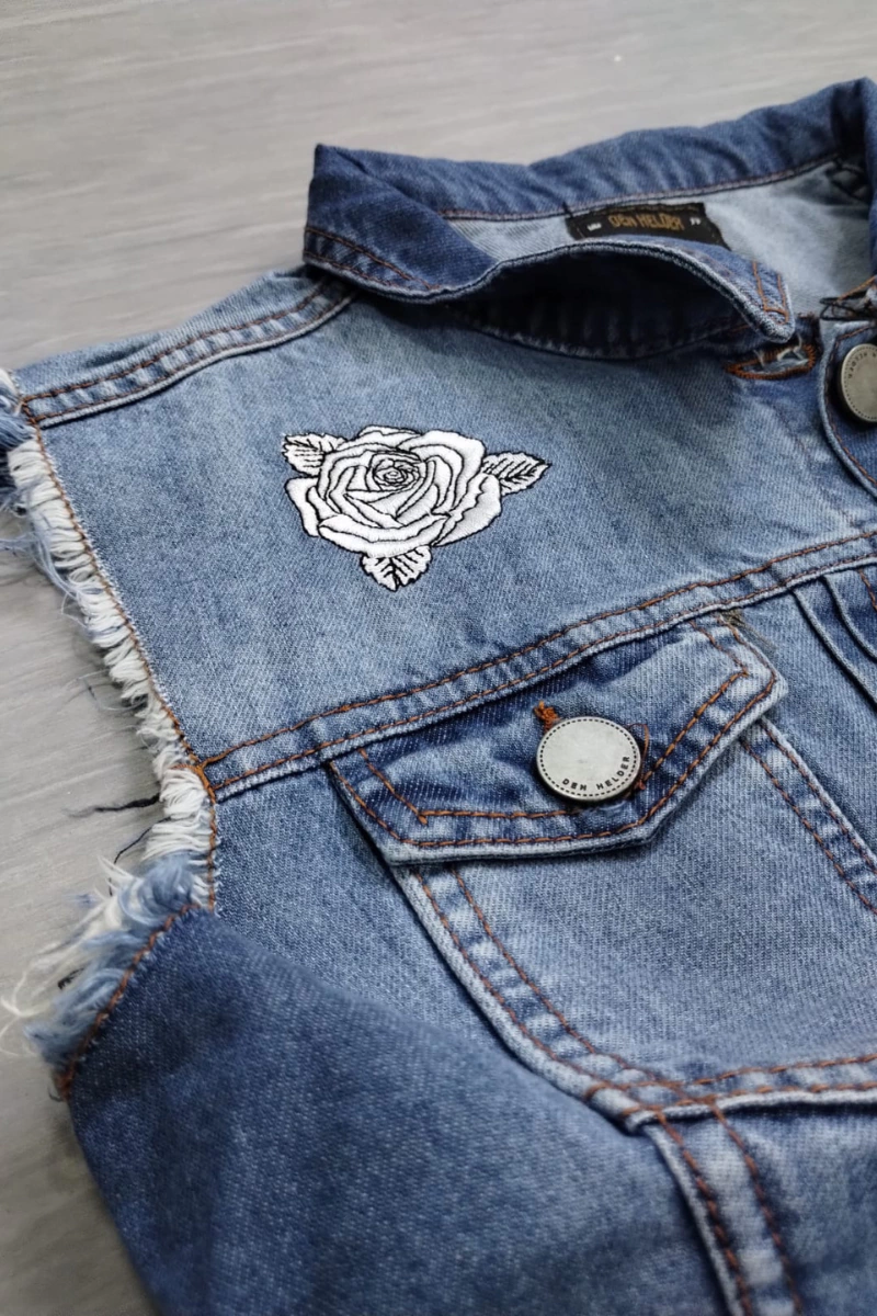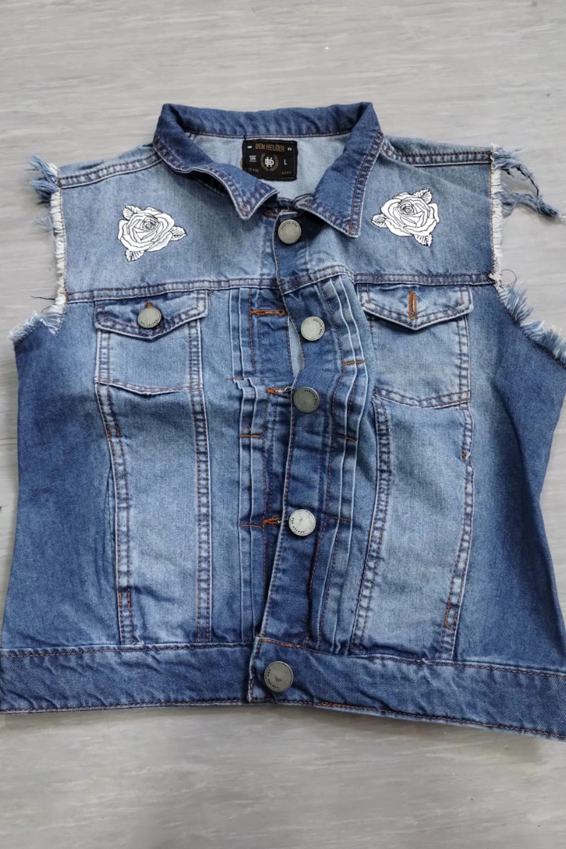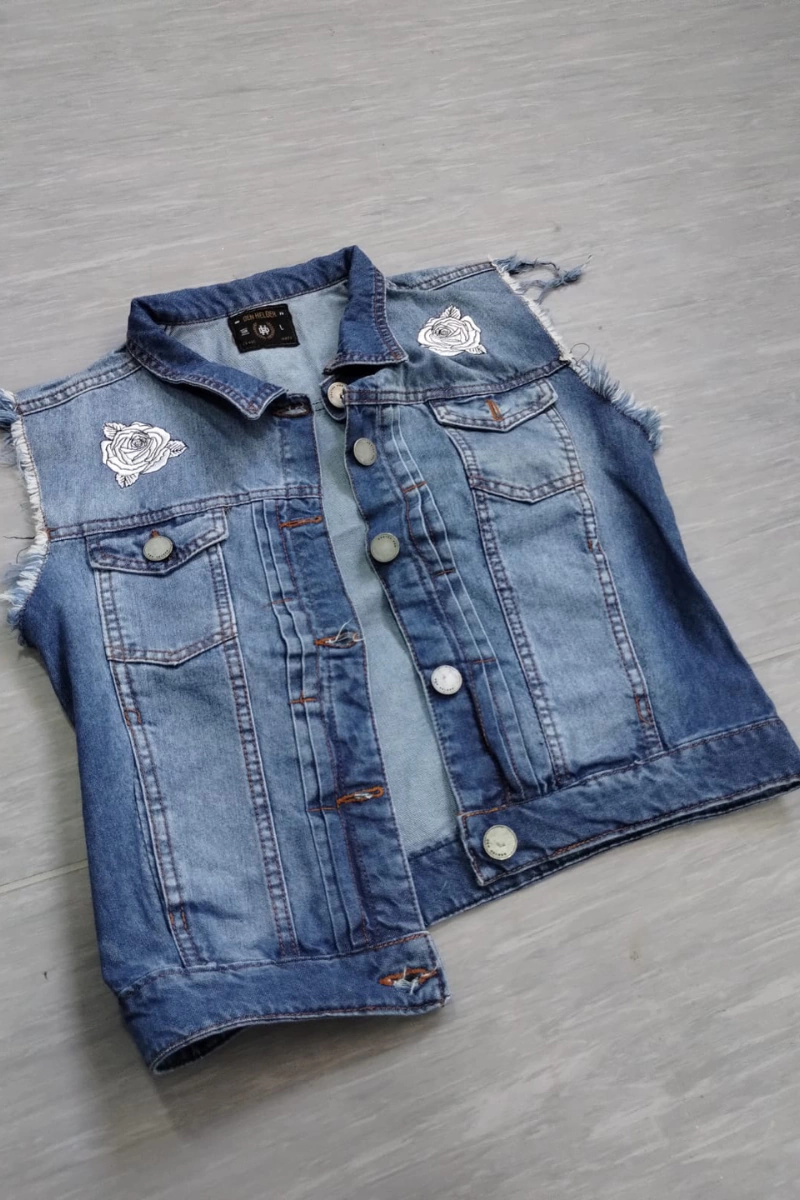 Confeccionado en Denim rigido, este chaleco cuenta con un proceso de desgaste, detalles de apliques bordados en ambos extremos. Bolsillos tipo sobre con botones al frente.