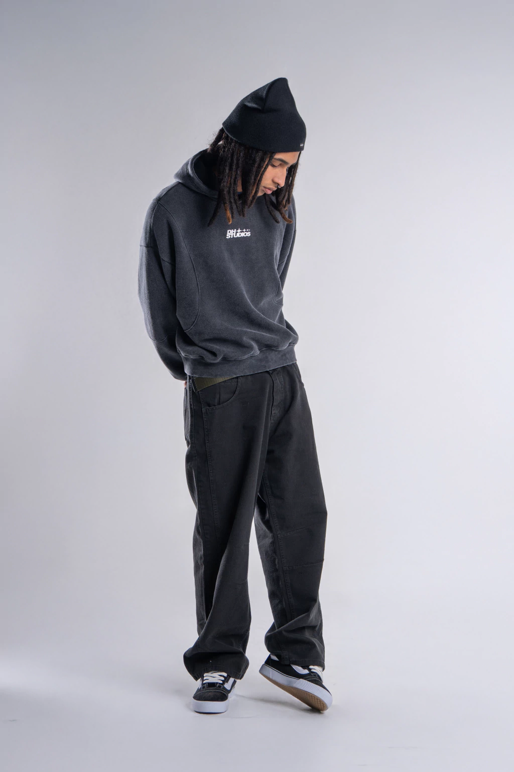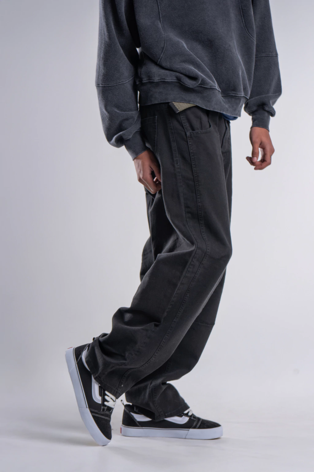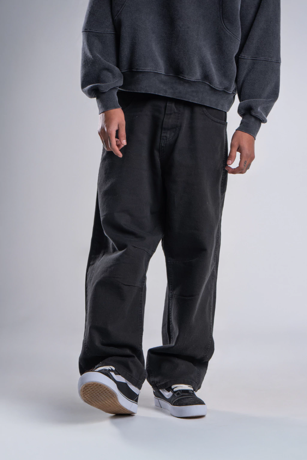 Confeccionado Gabardina Bull rigida, tiro medio con un calce Barrel, que genera un contorno de piernas semianchas abombadas que lo hace realmente comodo. Detalle de pinzas en rodillas y delantero con recorte desplazado. Cuenta con proceso de desgaste suave. Cierre delantero con boton y cremallera.