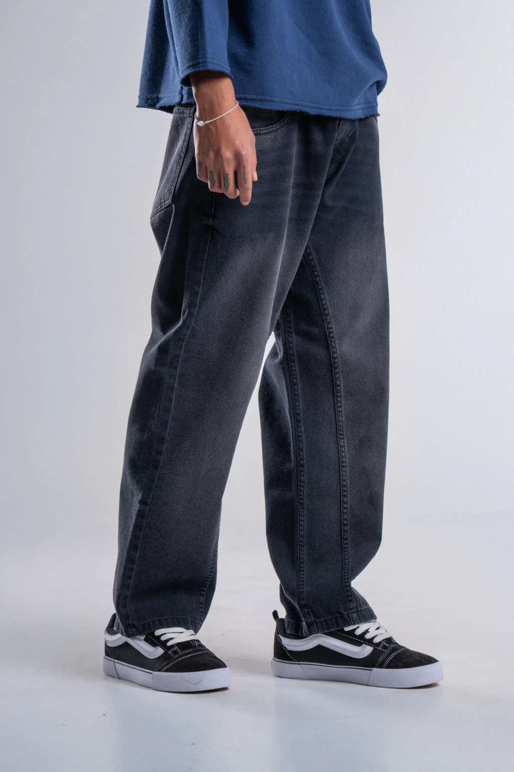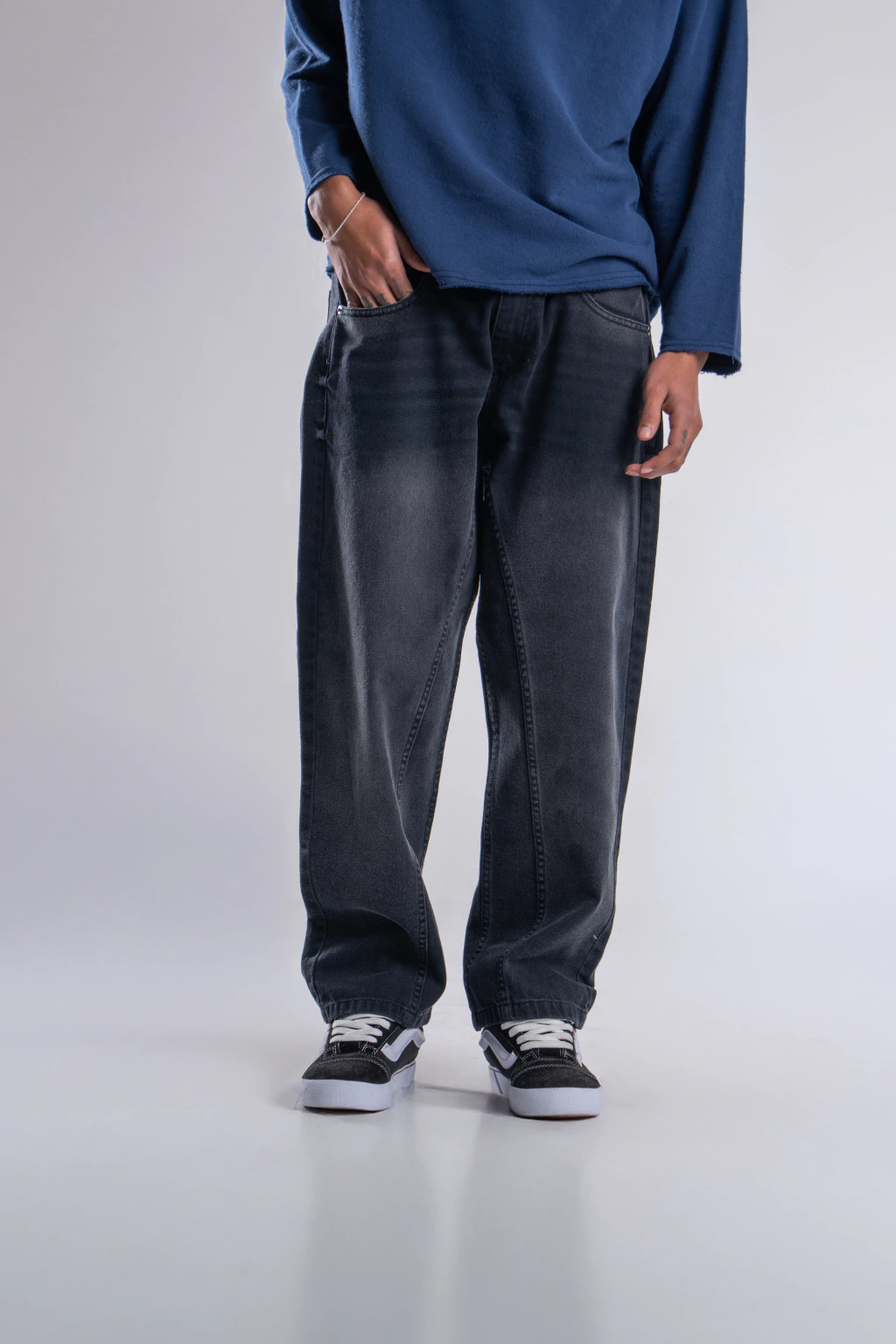 Confeccionado en Denim Black rigido, este pantalon tiro medio con un calce Barrel, genera un contorno de piernas Semianchas abombadas que lo hace realmente comodo. Tiene un Detalle de recorte en entre piernas. Cuenta con proceso de Desgaste suave. Cierre delantero con boton y cremallera.