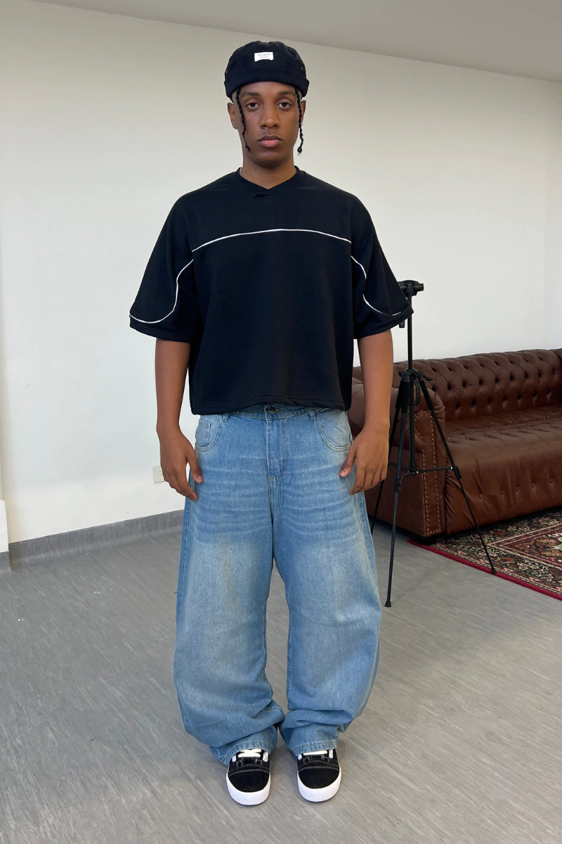 Confeccionado en Denim rigido, con un calce Baggy, bolsillos traseros rectangulares estilo skater con arte grabado laser . Detalle de doble costuras en las piernas traseras que generan un toque único. Cierre frontal con cremallera y botón.