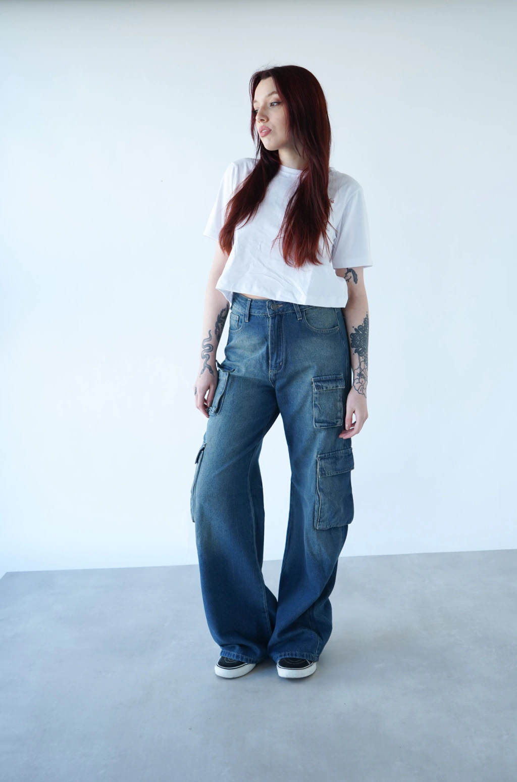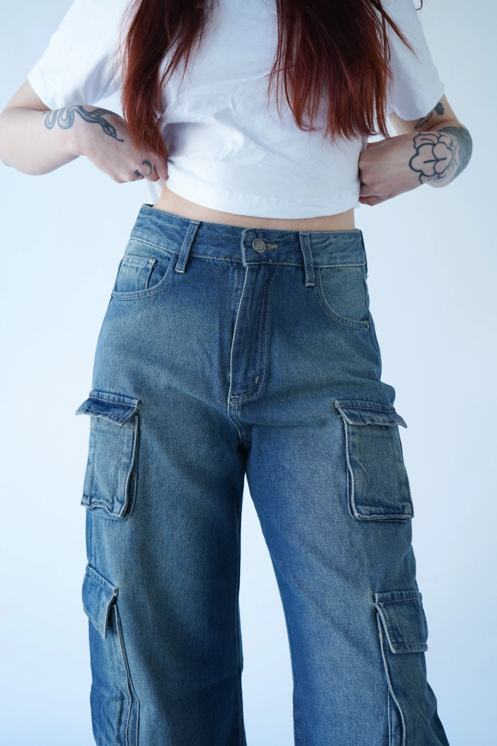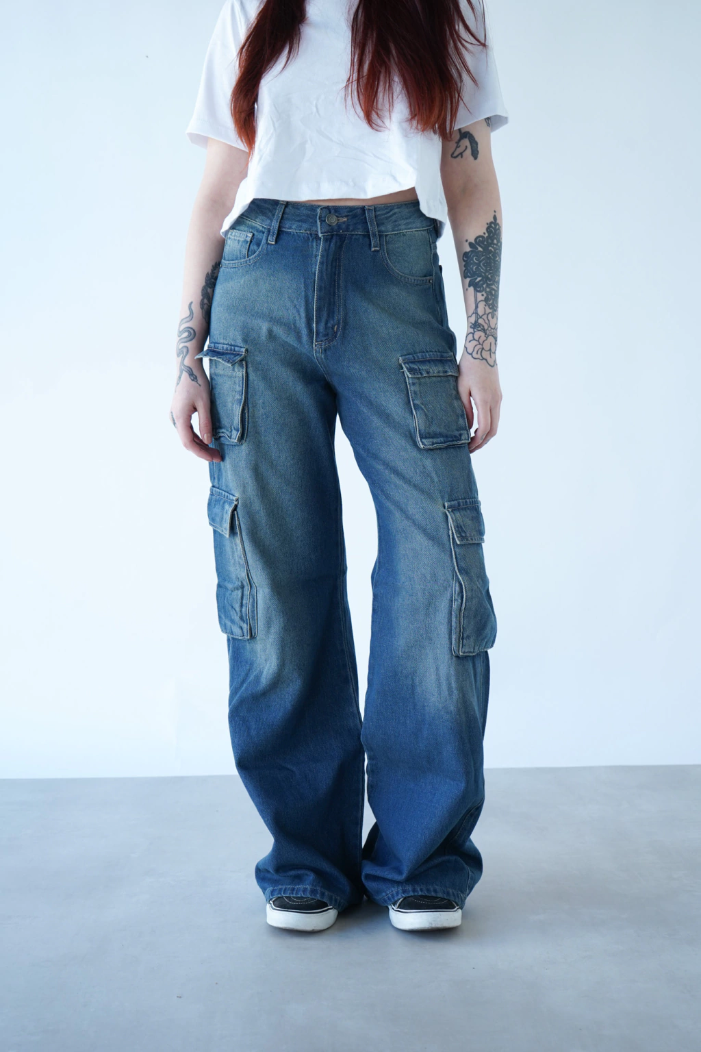 Confeccionado en Denim rigido, con un calce Wide Leg con tiro alto , con cinco bolsillos clasicos y cuatro bolsillos laterales con fuelles. . Cierre frontal con cremallera y botón.