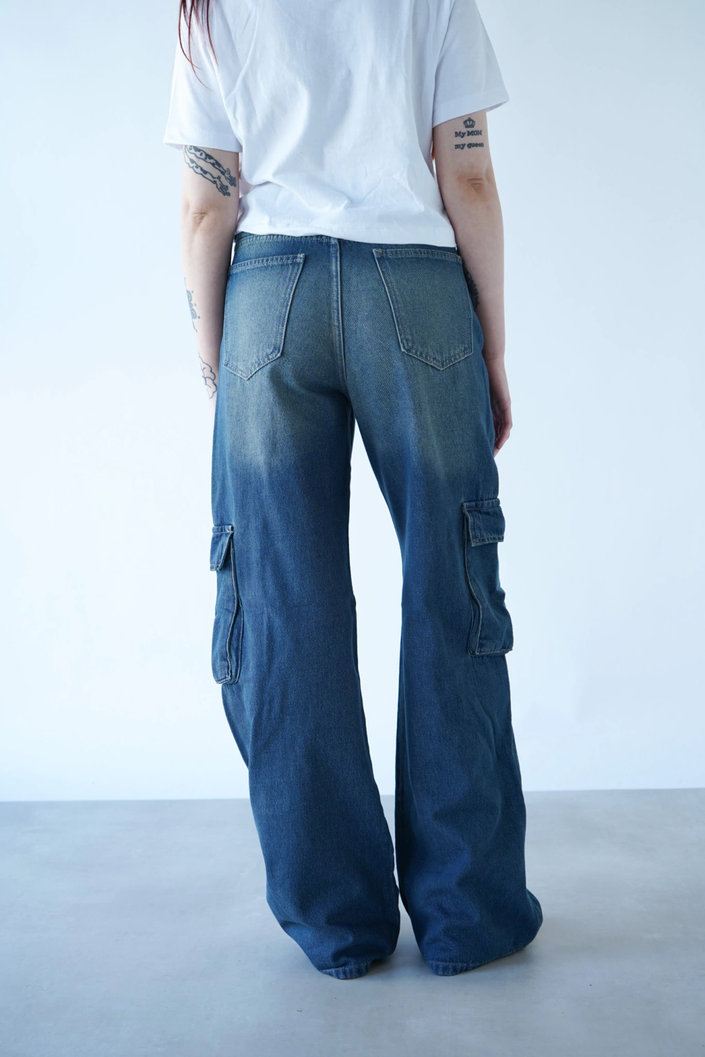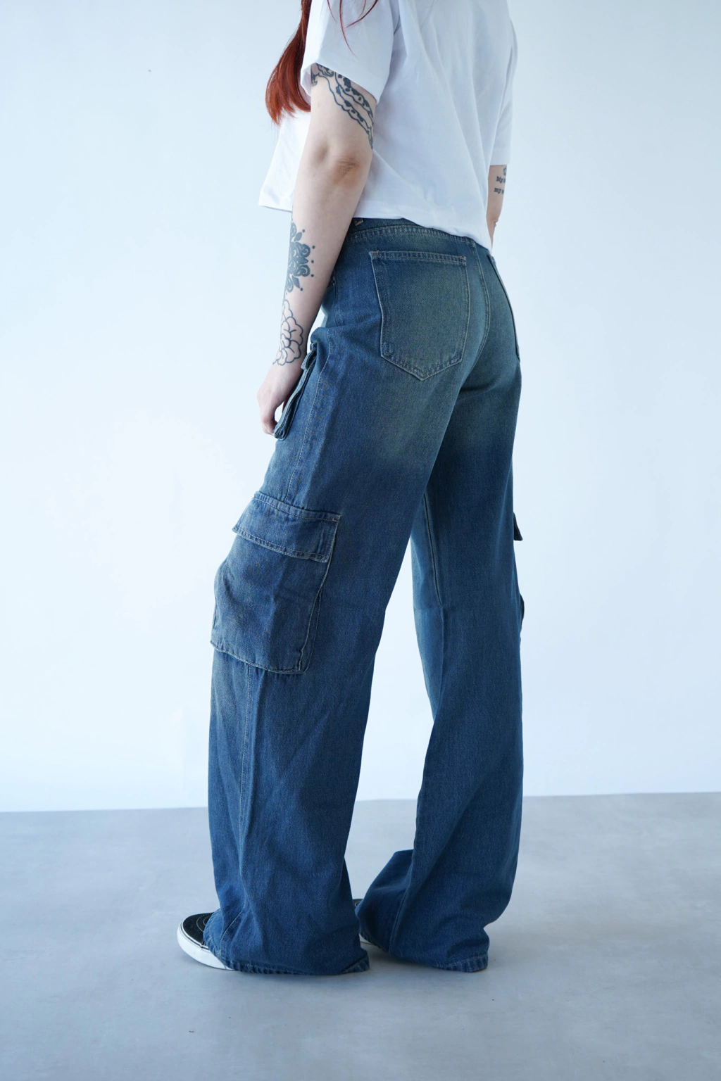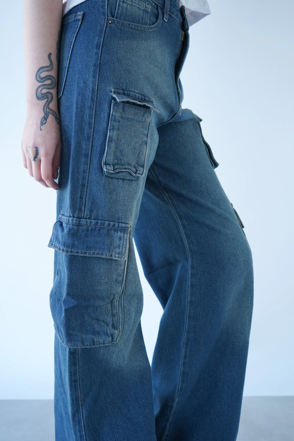 Confeccionado en Denim rigido, con un calce Wide Leg con tiro alto , con cinco bolsillos clasicos y cuatro bolsillos laterales con fuelles. . Cierre frontal con cremallera y botón.
