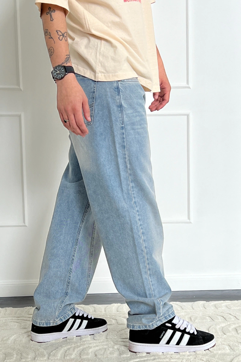 Confeccionado en Denim, con un tiro medio y un calce Barrel, genera un contorno de piernas Semianchas abombadas que lo hace realmente comodo. Detalle de Pinzas en rodillas y delantero con recorte desplazado.Cierre delantero con boton y cremallera.