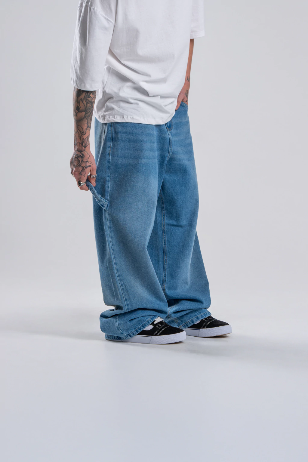 Confeccionado en Denim rigido, con un calce Baggy, bolsillos traseros rectangulares estilo skater y presilla lateral . Detalle de doble costuras en las piernas traseras que generan un toque único. Cierre frontal con cremallera y botón.