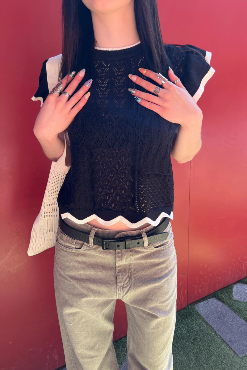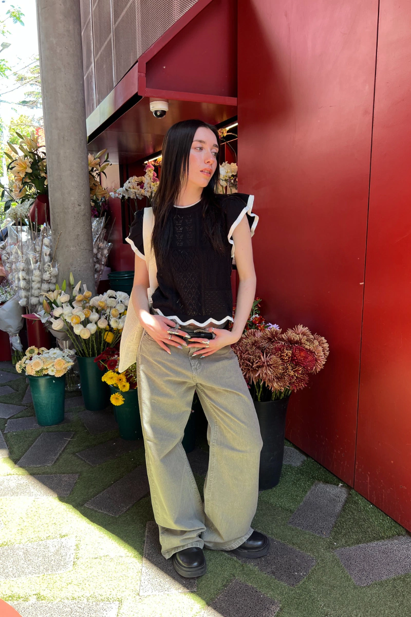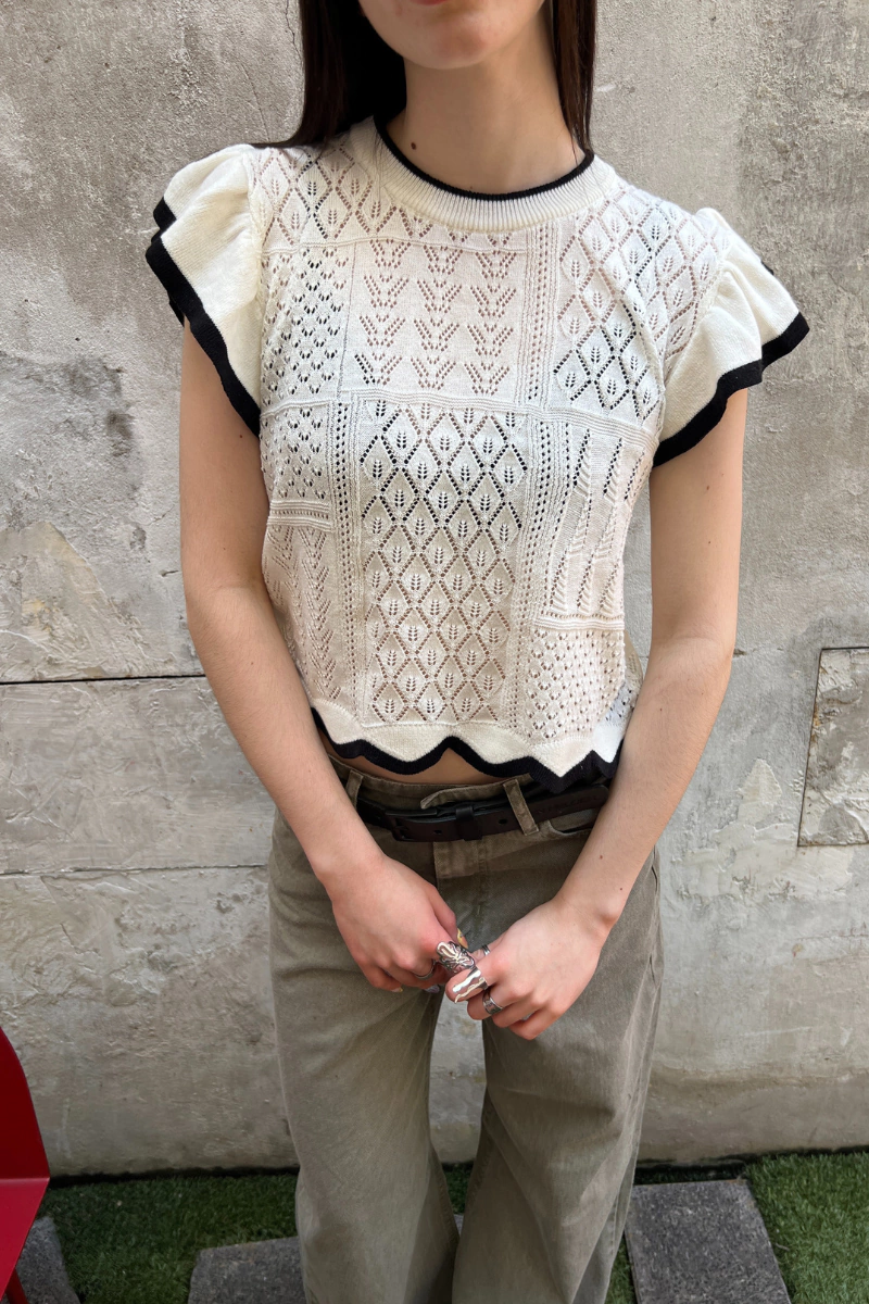 Remera Regular con tedijo tramado de hilo, cuello redondo con vivo y mangas volados.