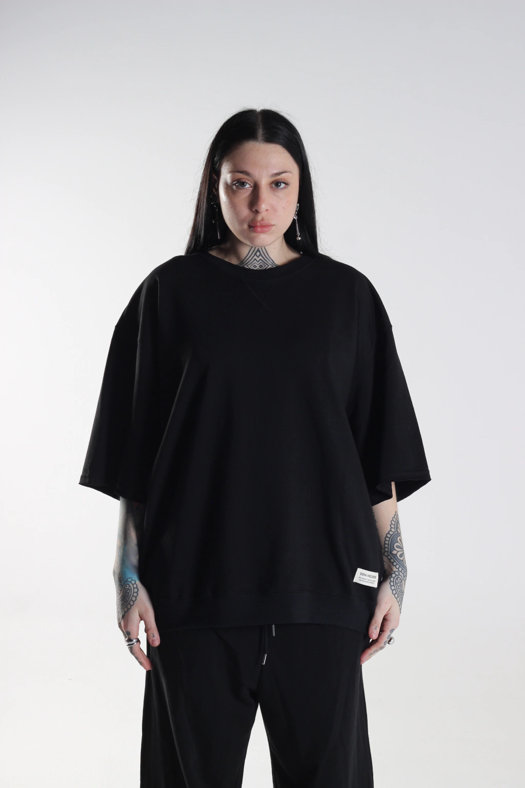 Remera confeccionada en tela Rústico de algodón, con un calce Relaxed, mangas amplias al corte, detalle en cuello con costuras, cintura de morley y con grifa inferior.